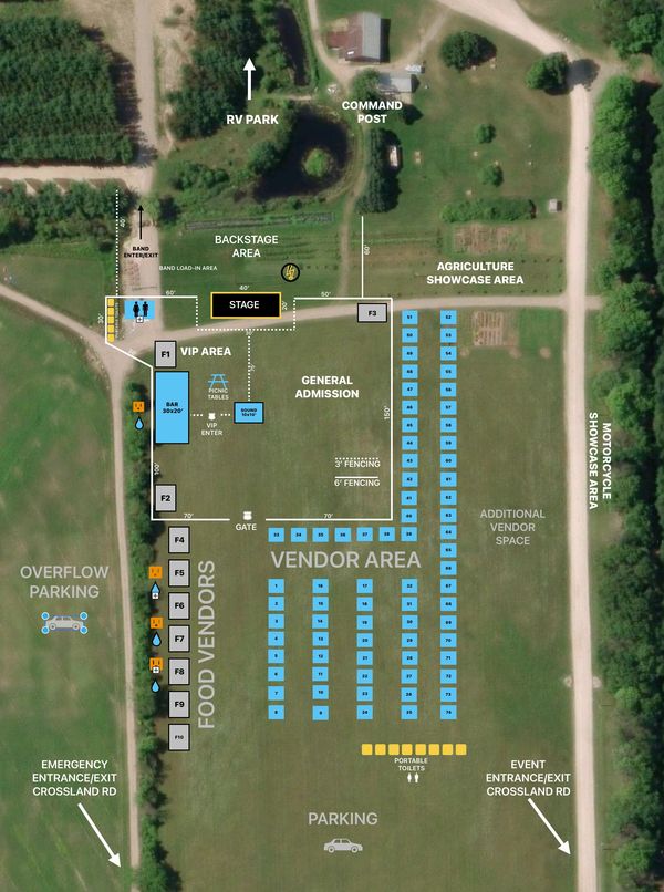 The food vendor area is on a level field and the food vendor booth sites are suitable for a a food truck/trailer or large 10'X10' tent.